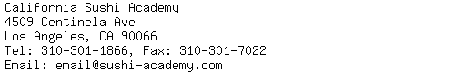 Additional information: The educational philosophy of the California Sushi Academy crosses borders, race and gender to bring greater Japanese cultural understanding and appreciation through the culinary experience. In the past it has been solely the right of Japanese male's to become sushi chefs. CSA has changed this, passing on its wealth of culinary knowledge to people of diverse backgrounds so that they may in turn share the beauty of Japanese cuisine and culture with others