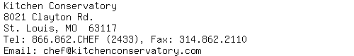 Additional information: Kitchen Conservatory is the premier cooking school in St. Louis, Missouri. We offer all the tools and knowledge for the ultimate kitchen. Please visit our fabulous selection of cookware, bakeware, cutlery, and a wide variety of useful tools.
